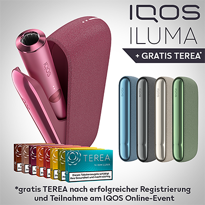 Registriere jetzt dein pinkfarbenes IQOS ILUMA mit uns gemeinsam! Du erhältst insgesamt bis zu 60 TEREA Sticks. 40 TEREA Sticks (zwei Packungen) für die Erstregistrierung und weitere 20 TEREA Sticks (eine Packung), wenn du am IQOS Online-Event teilnimmst. Die TEREA Sticks werden separat von IQOS versendet.