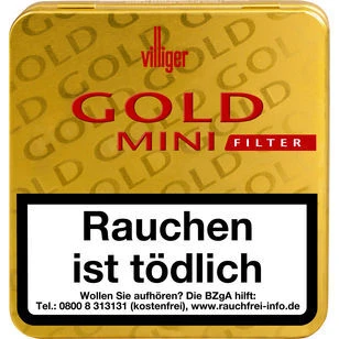 Villinger Gold Mini Filter Shortfiller aus dem Hause Villiger Söhne GmbH, aus einer erlesenen und sorgfältig aufeinander abgestimmten Tabakmischung aus besten Black Cavendish, Burley, Virginia Tabaken, umhüllt von einem hauchdünnen Deckblatt aus Ecuador Tabak. Daraus entsteht ein fruchtiger und aromatischer Geschmack von angenehmer Milde. Dieses leichte und milde Zigarillo ist besonders bei Einsteigern beliebt und bildet das perfekte Geschmackserlebnis, was sich mit einem Espresso noch perfekt abrunden lässt.